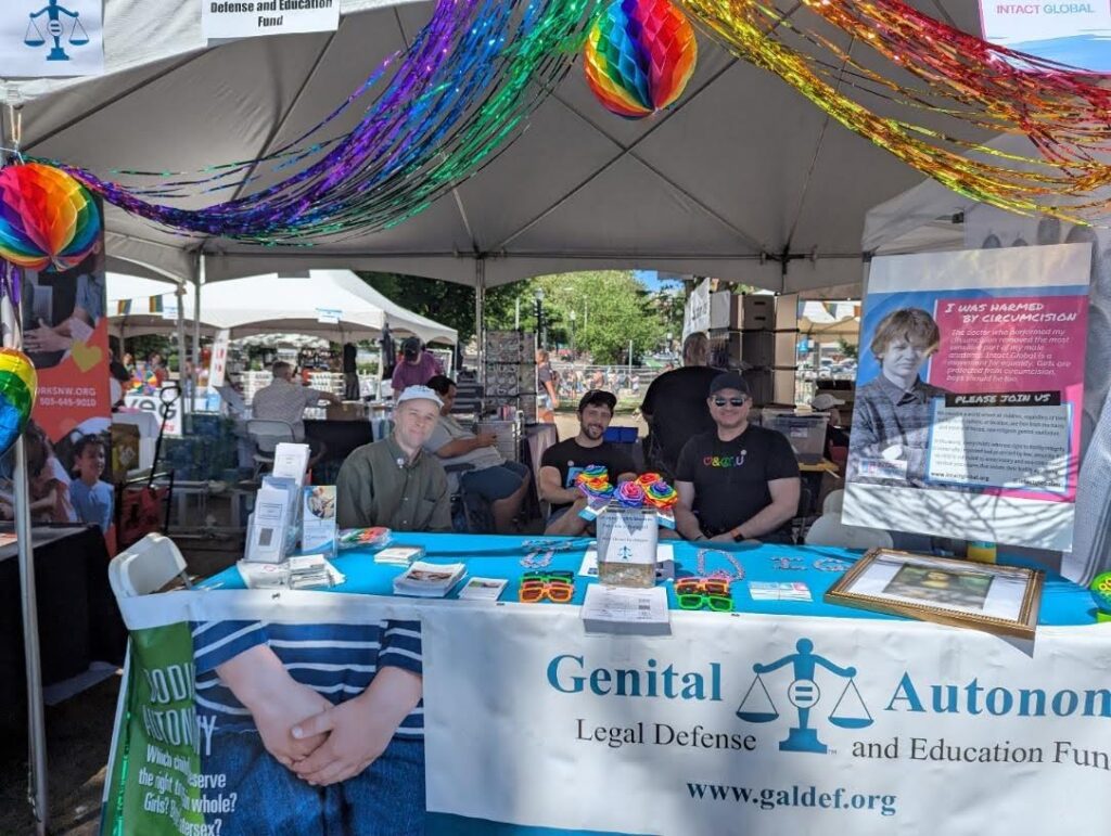 Intact Global Community Development director Che Johnson and Portland Genital Autonomy Collective founder Allie Arshad demonstrate their Genital Autonomy Pride at the GALDEF booth.